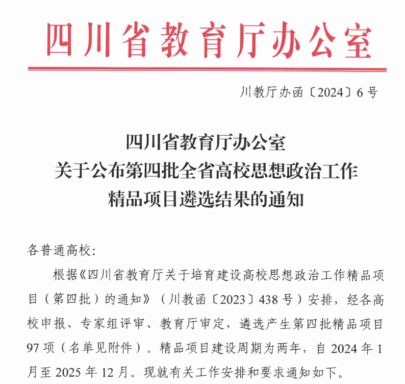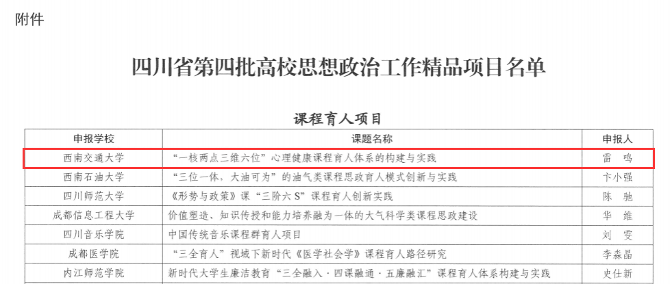 根据《四川省教育厅关于培育建设高校思想政治工作精品项目(第四批)的通知》要求,经组织申报、学校推荐、专家组评审、教育厅审定等程序,中心雷鸣副主任申报的《“一核两点三维六位”心理健康课程育人体系的构建与实践》获批立项第四批全省高校思想政治工作精品项目(课程育人)。