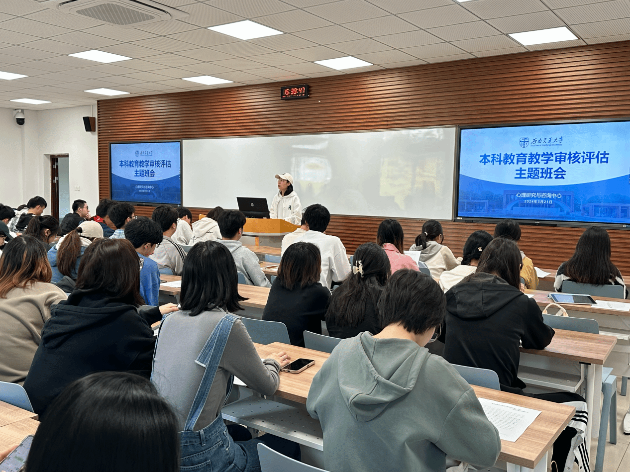 我校将于今年参加教育部新一轮本科教育教学审核评估,为了帮助同学们深入了解新一轮审核评估相关知识以及学校在学生学业投入、提升教育体验、提高支持服务、营造质量文化等方面的相关举措,2024年3月21日,瓜子影视 全体本科生在x1301开展本科教育教学审核评估主题班会,会议由辅导员李艳主持。