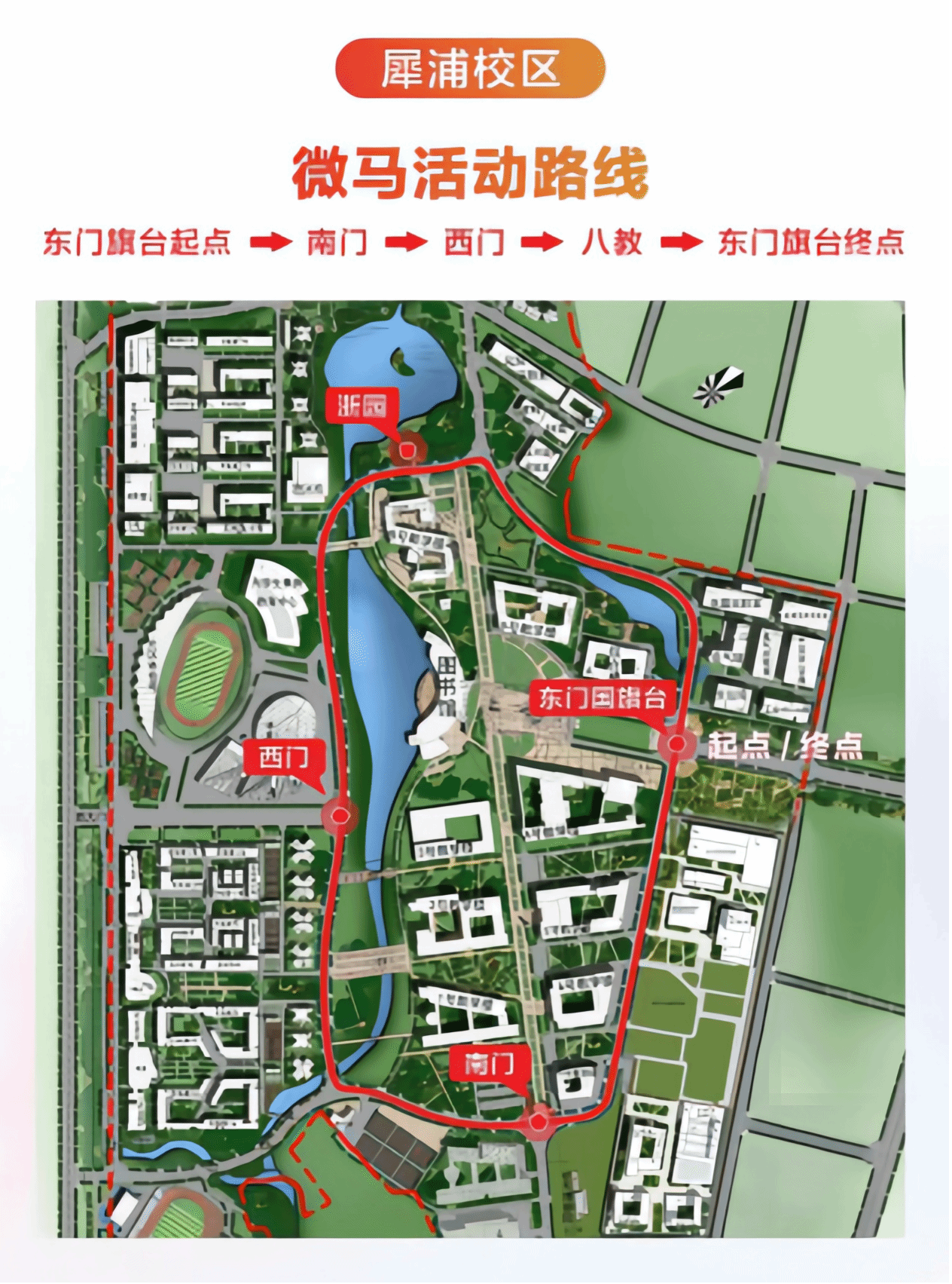犀浦校区将迎来微型马拉松环校跑活动,以奔跑的姿态迎接新生活的到来。从东门国旗台起跑,绕行犀浦校区内环线,最后回到终点,让我们用汗水书写青春的篇章!(记得打卡盖章,终点还有机会抽取大奖哦!)