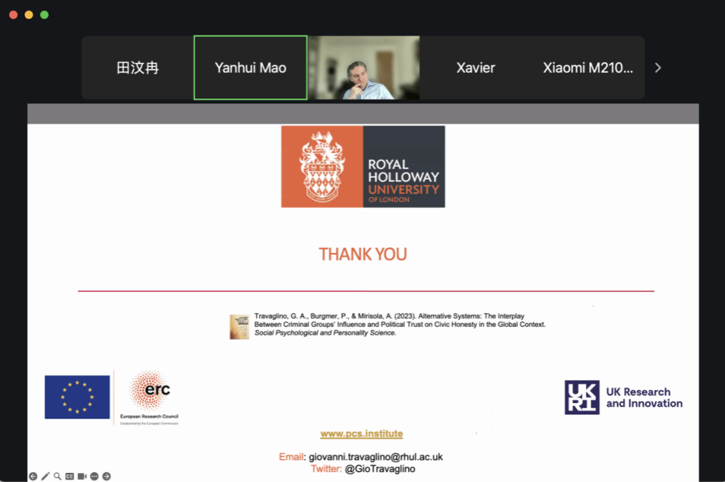 通过公开讲座的形式,于线上会议向中心师生普及社会心理学领域知识,特别是关于公民诚信、信任以及有组织犯罪对社会影响的深入理解。本次讲座邀请到了伦敦大学皇家霍洛威学院的Giovanni Travaglino教授,讲座的主题研究为“公民诚信的社会心理学:信任的作用与犯罪普遍性的调节效应”。本次讲座由瓜子影视