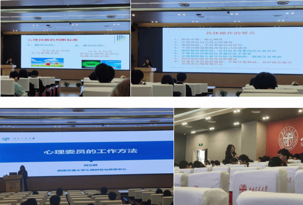 本次培训将心理委员工作的理论与实践相结合,在4月27日上午举办了两场培训会。张学伟老师首先开展了心理委员胜任力的培训,主要介绍大学生群体常见的异常心理与行为,及时帮助和疏导表现出异常心理与行为的同学。何立群老师在第二场报告会上介绍了心理委员的岗位要求和工作方法,希望心理委员能够立足课堂、寝室,多做心理健康知识的科普宣传、组织丰富多彩的心理班会活动。