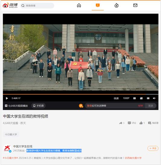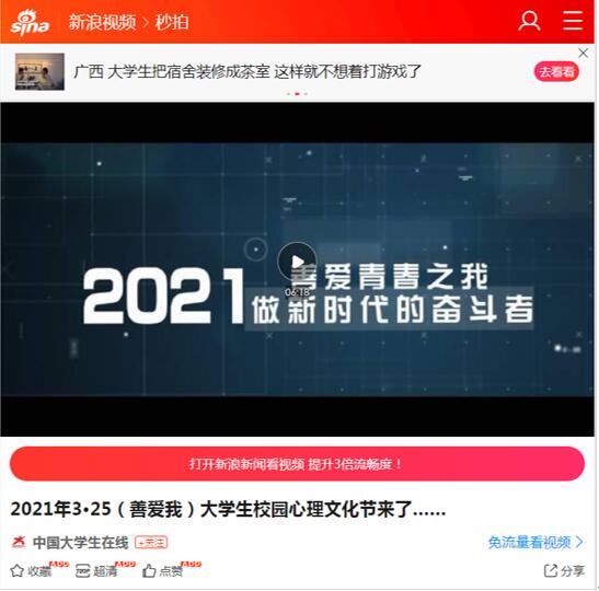 编辑的“3•25(善爱我)大学生校园心理文化节”微视频《善爱青春之我,做新时代的奋斗者》。这也是教育部中国大学生在线网站、在线官微连续三年报道3·25(善爱我)大学生校园心理文化节。新浪网等主流媒体也进行了转发。