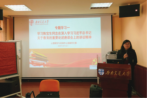 随后,刘咏梅书记领学了《习近平:年轻干部要提高七种能力》重要讲话精神,强调干部特别是年轻干部要提高政治能力、调查研究能力、科学决策能力、改革攻坚能力、应急处突能力、群众工作能力、抓落实能力。刘咏梅书记提出,不仅仅是中心干部要学习,中心每位教师都应该带动身边人一起学习,在自己的工作岗位上提升解决问题的能力。