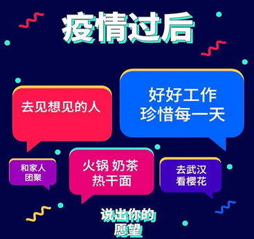 讲座开始时,赵老师与同学们谈论了疫情结束后自己想做的事情,同学们都积极的参与互动,用文字的方式呈现了自己的想法:出门逛逛,呼吸新鲜空气;各种吃喝玩乐;旅游;回学校。虽然大家的回答各不相同,但都或多或少的呈现出大家因为待在家的时间过长,而迫不及待的想要出门“放风”的心情。