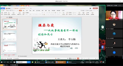峨眉咨询部李玉梅老师于4月2日下午15:00通过网络方式开展了一场题为“温柔与爱——从叙事视角看不一样的创伤和死亡”的线上心理专题讲座。