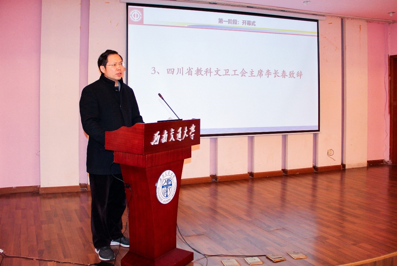 随后,四川省教科文卫工会李长春主席致辞。李主席对四所交通大学工会同仁的出席表示热烈祝贺,并介绍了四川省经济、社会发展情况和工会工作,以及近年来省教科文卫工会创建的特色鲜明、成效显著的工作成果。李主席指出,四所交通大学工会工作研讨会是工会同仁学习中央精神、研讨工作、交流经验的重要平台,希望交通大学工会组织继续发挥“排头兵”“领头雁”作用,进一步担负起树立标杆、提供典型、输出经验的重任,把交通大学工会工作的经验成果向四川省高校辐射,促进我省高校工会工作水平的提升。