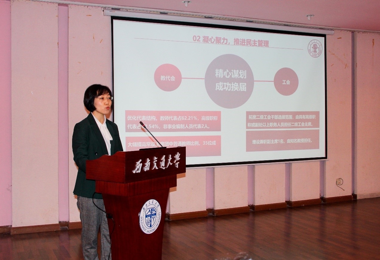 当天下午,会议进入第四阶段,四所交通大学的二级部门工会主席就学院层面的工会工作进行了研讨交流:上海交大机械学院工会孟雁主席作《服务院为实体,发挥工会作用》,西南交大原瓜子影视