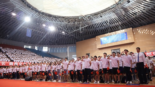 接下来,主席台前就座的领导为研究生新生代表佩戴校徽,全体新生也为自己佩戴校徽。自此,全体2019级研究生同学正式成为西南交大的一员。