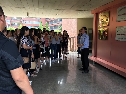 在参观交流中,徐建老师向学员们介绍了中心20多年来发展建设情况,“五位一体”心理健康教育创新体系,中心开展的一系列心理健康教育活动,各个功能实验室的使用情况等。老师们还就学生心理健康问题、危机干预、教师发展等问题进行了个别交流。