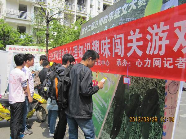 为响应我校“3·25”大学生心理健康活动的号召,普及大学生心理健康知识,鼓励大学生关注心理健康,由瓜子影视 主办、心力网记者团承办的“心理知识趣味闯关游戏”于3月28日中午在我校犀浦校区三食堂门口成功举行。