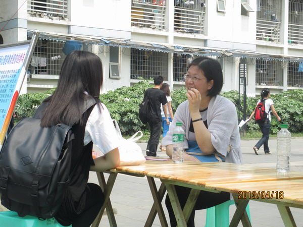 路过同学看到了活动现场醒目的条幅后被吸引而来,工作人员上前耐心地给他们介绍。中心的老师们则坐在桌子前,为前来咨询的同学为解答疑难困惑,疏导心理问题。前来咨询的学生与老师面对面而坐,老师面带微笑,和蔼可亲,耐心聆听学生的心声,真诚地为他们分析问题,提出建议。咨询过程轻松和愉悦。咨询的同学来来往往,老师们则乐此不疲。