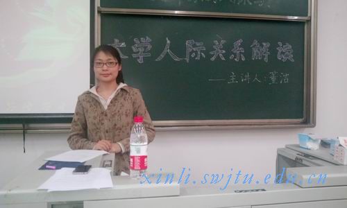 5月24日下午2:00,在2231瓜子影视 主办的“心力论坛”系列讲座中,瓜子影视 老师董洁为同学们解读大学人际关系,解决他们的人际交往问题。虽然到场的学生人数不是很多,但董洁老师依然讲得绘声绘色,尽职尽责,大家也听得十分投入。