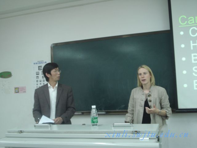 两个年级的学生及众多心理学爱好者连续作了两场精彩纷呈的讲座后,Melissa birkett博士又于5月20下午在x1230为众多听众讲解了美国心理学及其培训的相关情况。讲座进行中仍然由外国语学院费维宝老师担任翻译,此外瓜子影视