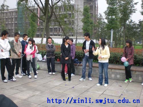 10月11号下午2:30,交运学院心灵俱乐部在图书馆后面的广场上举行了团队心理辅导活动。活动主要分为四个部分:分队心理交流、团队心理辅导、团队心理娱乐活动、团队心理总结。
