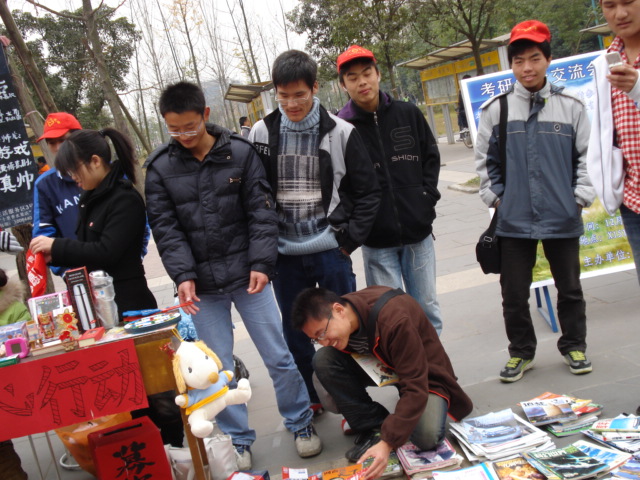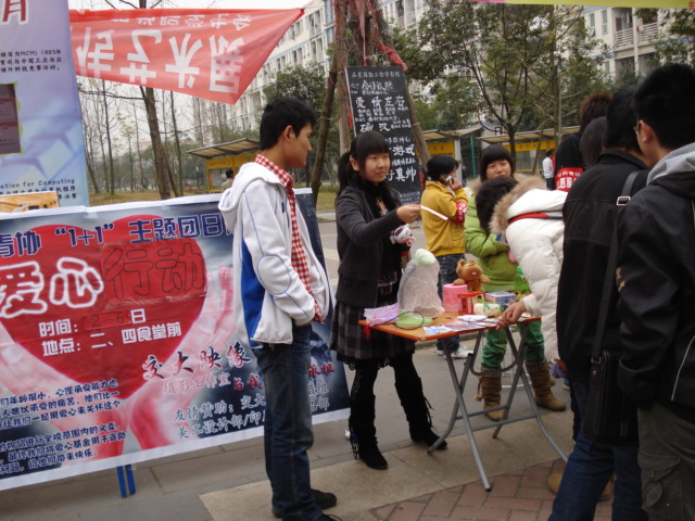自11月2日至6日,08级材料6班和成型1班在二,四食堂门口开展了由材料学院青协主办的“爱心义卖”活动。虽然天气很冷,但活动现场流动着的暖暖温情感动了每个人。 据悉,本次义卖所有待售物品全部由同学募捐而来,义卖所得将全部捐给成都市儿童福利院,用于改善院里儿童的生活,尽管这次义卖筹集的钱对于那些儿童长期的生活开销来说只是杯水车薪,但却充分体现了我校学子对社会弱势群体的关怀与爱心。活动过程中,桌子上和地上摆的琳琅满目的物品吸引大批同学围了上来,组织人员积极主动,热心地对前来询问的同学进行回答。待售物品的价格是购买者根据自己的认知定的,因此双方都对这笔交易很满意,一时间现场气氛热烈而融洽。当被问到为什么不去商店买这些东西时,很多同学回答说是想为社会做些事情,为那些儿童送去自己的一份爱心。这着实让人感动和敬佩。 目前,此次活动已筹集将近1000元,这笔钱有着沉甸甸的分量,它代表着现今大学生的良好风貌及社会道德,传递着人间的温情与爱心。
