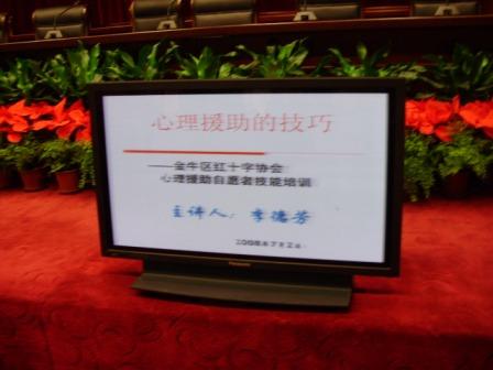 在此次培训中李德芳老师主要讲述了自然灾害与人类的应急反应,从抗震救灾中的温家宝总理谈心理援助,心理援助的技巧,心理援助志愿者的自我保护这四个方面。
