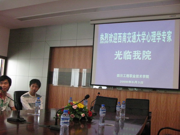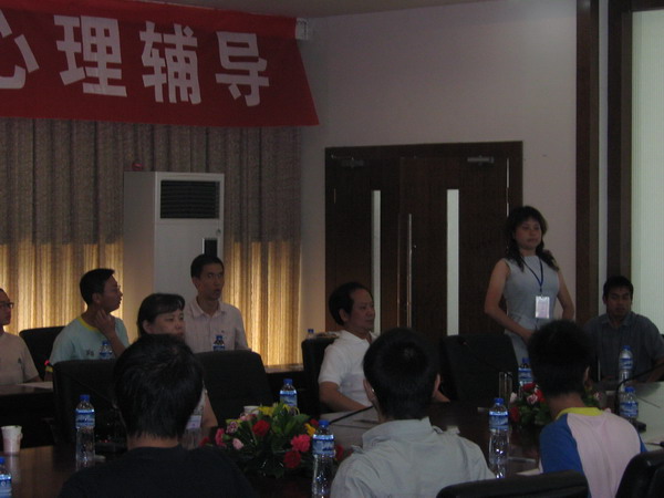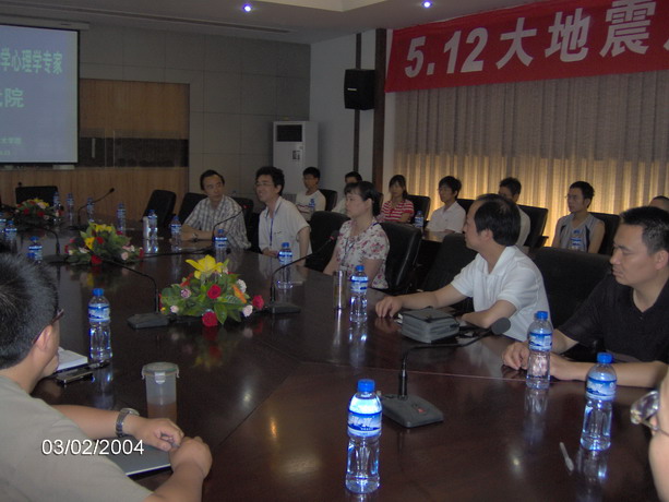 宁维卫、陈丽、田瑞琪等老师的到来,会议室里顿时响起了雷鸣般的掌声。首先宁主任先做了讲话,“灾后的心理调试是一个长期的过程和系统的工程,同时也是需要谨慎而行的”,本次辅导更侧重于了解该校师生目前的心理状态和心理需求,通过问卷和访谈的方式确定该校师生需要怎样的心理援助,在此基础上制定长期的援助计划,他还提出了积极应对灾难的相关建议。接着陈丽老师也做了精彩的发言,通过一些鲜活的事例和咨询个案,归纳出应对地震灾难的积极态度和做法。随后田瑞琪老师带领大家以团体游戏的方式活跃了全场的氛围,并教给在座的师生几种放松的方法。最后对该校的同学进行了针对性的问卷调查。