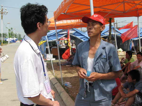 从四川工程职业技术学院出来后,宁主任一行人又赶往汉旺东汽进行调研,一路走访了沿途的各类志愿者、汉旺教育中心的值班工作老师和各安置点的受灾居民,了解他们的受灾情况以及他们目前的心理状态,为长期、系统的灾后心理援助积累第一手资料。调研工作本身也给予了被走访者莫大的鼓舞和安慰。