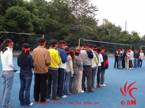分组过后进行的第一个环节是盲哑人排队。开始前,每个人都不准说话且眼睛被蒙上,然后指导老师在每个人耳边轻轻告诉一个号,并保证这个号只有本人知道,然后各小组按照号数从小到大依次排成一条直线。最终,不超过5分钟各队运用独特的沟通方式排号了队,顺利过关。