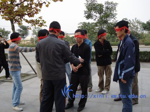 第一个任务完成后,大家又接受第二个挑战。同学们扮演盲哑人,然后请他们按顺序排队。在各队经过短时间商量之后,同学们被蒙上眼睛,然后马老师悄悄告诉各自的序号,要求队员们在不能讲话的前提下按顺序排成一排。由于有了完成上一个任务的经验,同学们都有了一定的团队意识,任务很快就完成了。