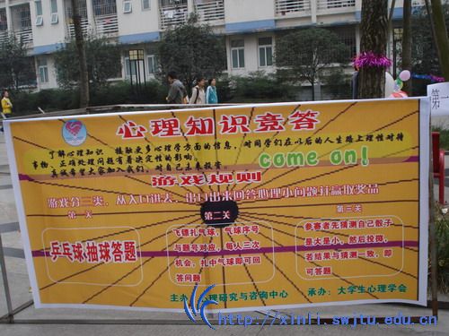 活动一开始,就吸引了许多同学的参与。竞答活动一共设了三个关卡,第一关:抽乒乓球答题,第二关:飞镖扎气球答题,第三关:掷色子答题。每个环节都将娱乐与知识竞答结合在一起。答题正确后方可获得奖品并进入下一关。有的同学在第一关的时候就被淘汰,心里非常后悔平时怎么没有多了解一些心理健康的知识;而有的同学连闯三关,获得三个奖品,不仅快乐而且自豪;有的同学虽然闯关没有成功,但却不肯离去,表示还要去试一试。一些闯关的同学们也在一旁互相交流自己抽到题目,询问答案究竟是什么,为什么等等。场地里欢声笑语不断,学习交流气氛更浓。愉快而轻松的活动让同学们不仅收获了快乐,同时也获得了知识。