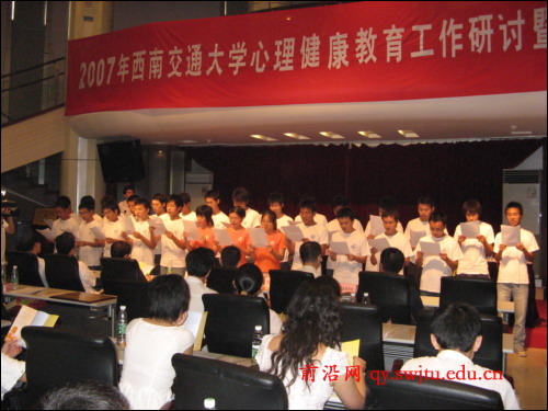 “丰产不等于丰收,大学生们成才的前提是心智健康。今天我们和成都市第四人民医院共同开通‘心理关怀绿色通道’,就是为了更好地为学生服务,使他们心智良好地迎接人生。” 7月31日上午9点,在镜湖宾馆多功能厅召开的2007年心理健康教育工作研讨暨表彰会上,校党委书记顾利亚语重心长地发表了讲话。 这也是我校首次隆重召开心理健康教育工作研讨暨表彰会,会议由瓜子影视