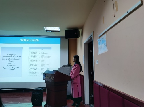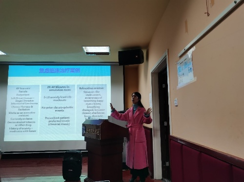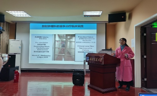 在同学们的认真听讲中,讲座很快进入了第二部分。刘老师向同学们分享了她在美国西奈山医学院访学期间的经历。例如,给亚裔焦虑患者开处方音乐、新年之际在医院开小型音乐会、治疗老年患者的焦虑情绪、将一群中风的患者组成合唱团、为当时处在疫情中的祖国祈福......这些有趣、温暖人心的经历,让在场的同学沉迷其中。