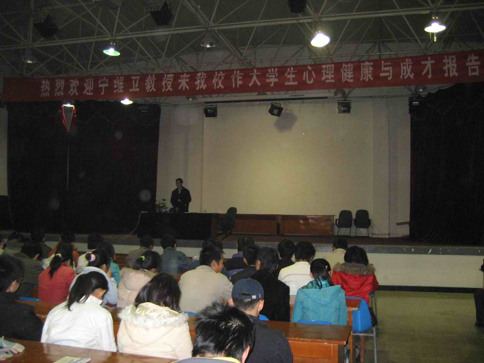 下午,宁教授在临潼校区学生第二俱乐部为500余名大学生作了题为《开掘心智的金矿》的心理健康与成才报告。宁教授从如何树立自信心、责任感、如何发挥团队精神和个人魅力四个方面为学生们提出建议和希望,受到学生们的热烈欢迎。 (学工部 卢勇)
