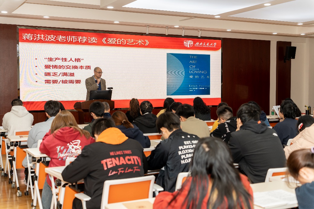 随后,蒋洪波老师为大家荐读了埃里希·弗洛姆的著作《爱的艺术》。他通过分享自己的阅读体会和深刻感悟,深度剖析了“资本主义下爱情的交换本质”等社会现象。他引导大家思考如何在日常生活中实践爱的艺术,以及如何通过自我成长来提升爱的能力。蒋老师的讲解深入浅出、引人入胜,让与会者受益匪浅。