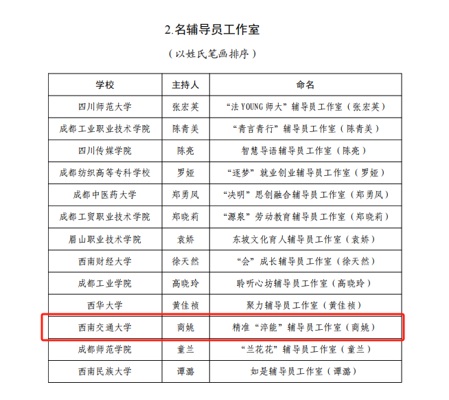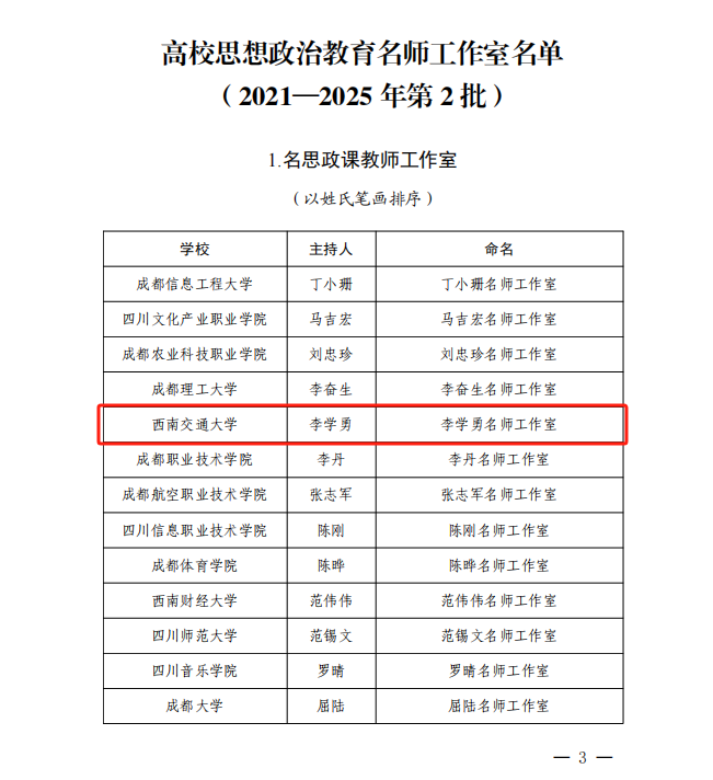 近日,中共四川省委教育工作委员会、四川省教育厅公布(2021—2025年第2批)高校思想政治教育名师工作室名单。学校马克思主义学院副院长李学勇教授主持的“李学勇名师工作室”入选名思政课教师工作室,土木工程学院辅导员商姚主持的“精准‘淬能’辅导员工作室”入选名辅导员工作室,瓜子影视