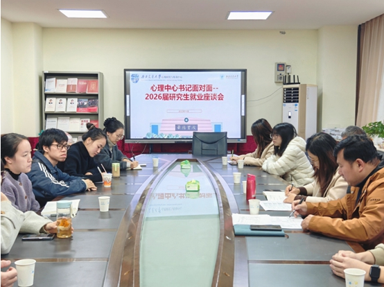 在犀浦校区X5429会议室组织召开书记面对面2026届研究生就业座谈会。中心党委书记刘咏梅、副书记孟凡春、副主任李启明、辅导员樊菊与全体研三同学围坐交流,共同分析当前就业形势,探讨个人发展方向。