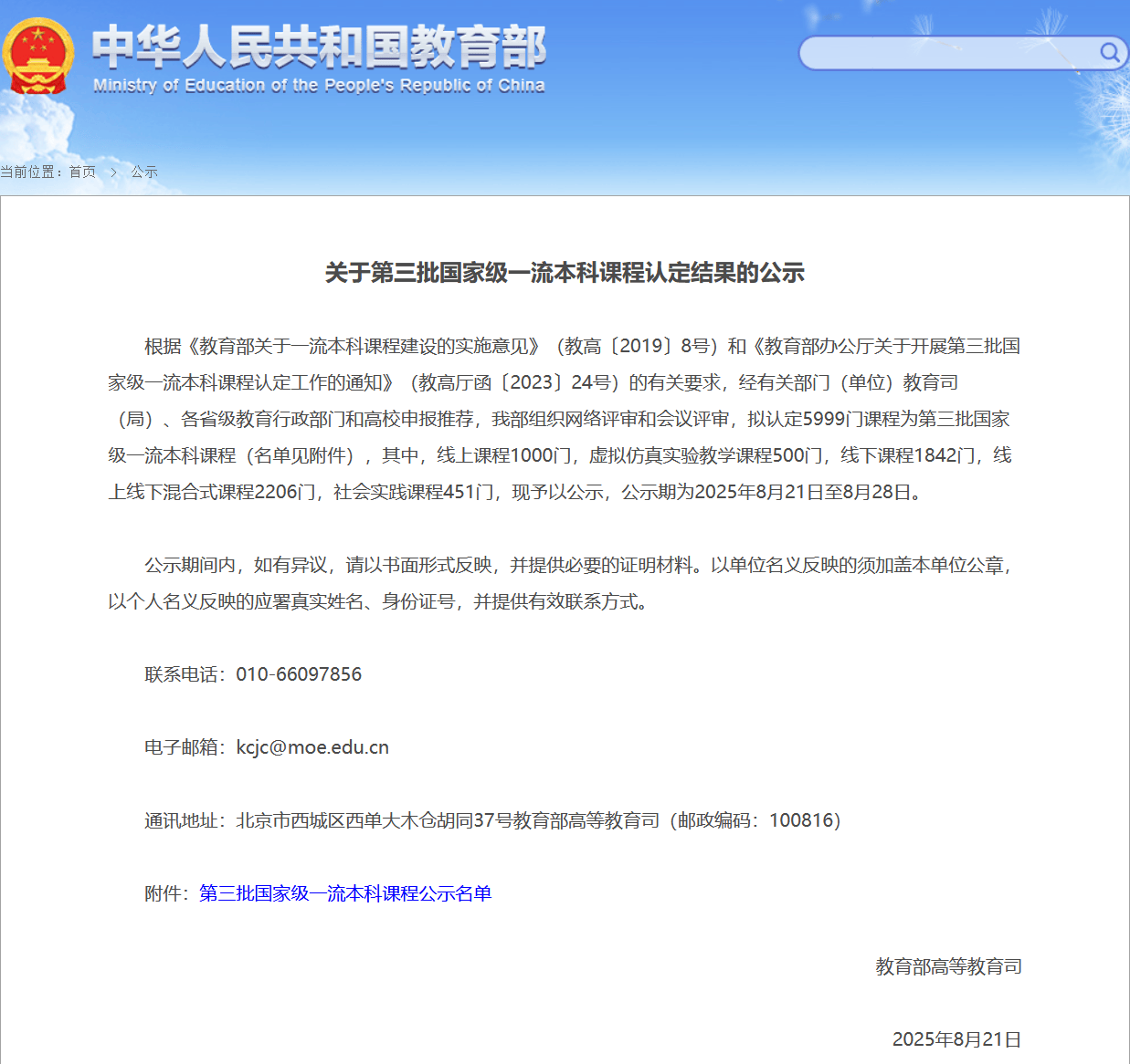 近日,教育部正式公布第三批国家级一流本科课程认定名单。在本次评选中,全国高校共有5999门课程脱颖而出,涵盖线上一流课程1000门、虚拟仿真实验教学一流课程500门、线下一流课程1842门、线上线下混合式一流课程2206门,以及社会实践一流课程451门。