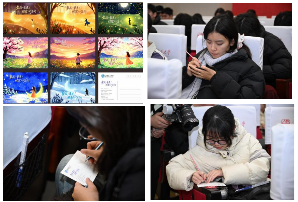 随后的“明信片·写给‘遇见’的你”环节温情满满。心理委员们在座椅前方的明信片上写下“加油!”“你很棒!”等鼓励话语,随机传递给身边同伴。一张张卡片如微光流转,汇聚成温暖星河。全体师生齐声喊出“聚成一束光,照亮向”,并在口号声中合影留念,定格下这一充满希望的瞬间。
