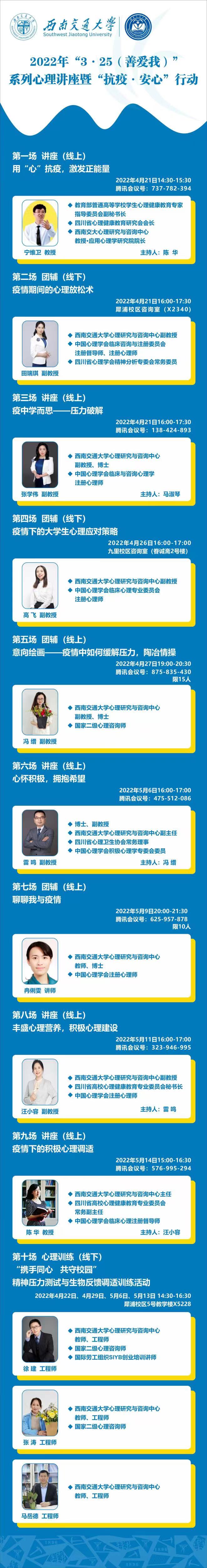 近期全国本土聚集性疫情呈现点多、面广、频发的特点,疫情防控形势较为严峻复杂。为"携手同心 共守校园”凝聚全校上下共抗疫情的坚定信念,做好人文关怀和服务保障,瓜子影视 发挥专业特长,决定于2022年4月-5月面向全校师生开展2022年“3•25(善爱我)”系列心理讲座暨“抗疫•安心”行动。届时将由12位专家组成员开展10场专题讲座、团体辅导和心理训练活动,欢迎全校师生踊跃报名参加。具体安排如下: