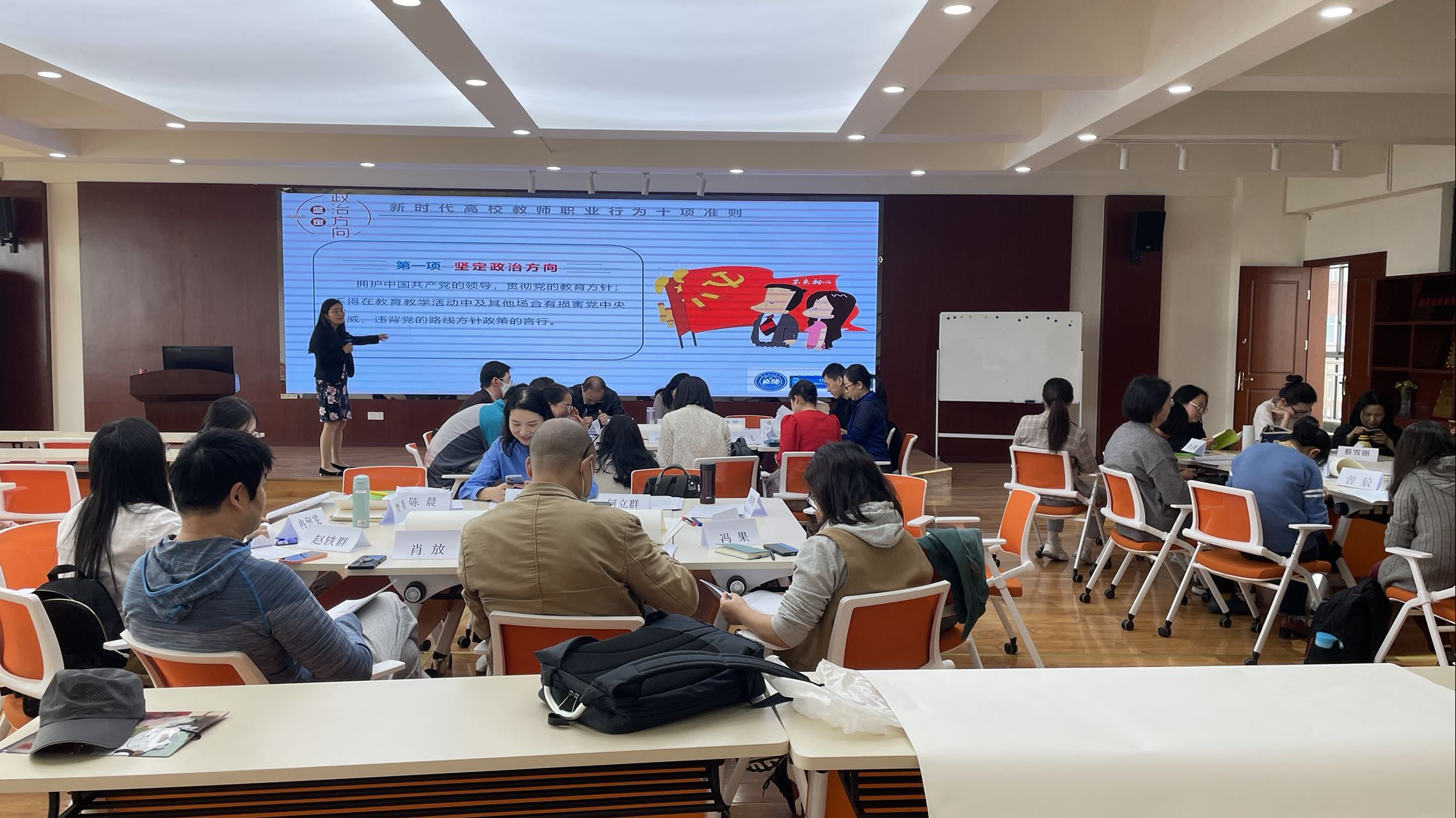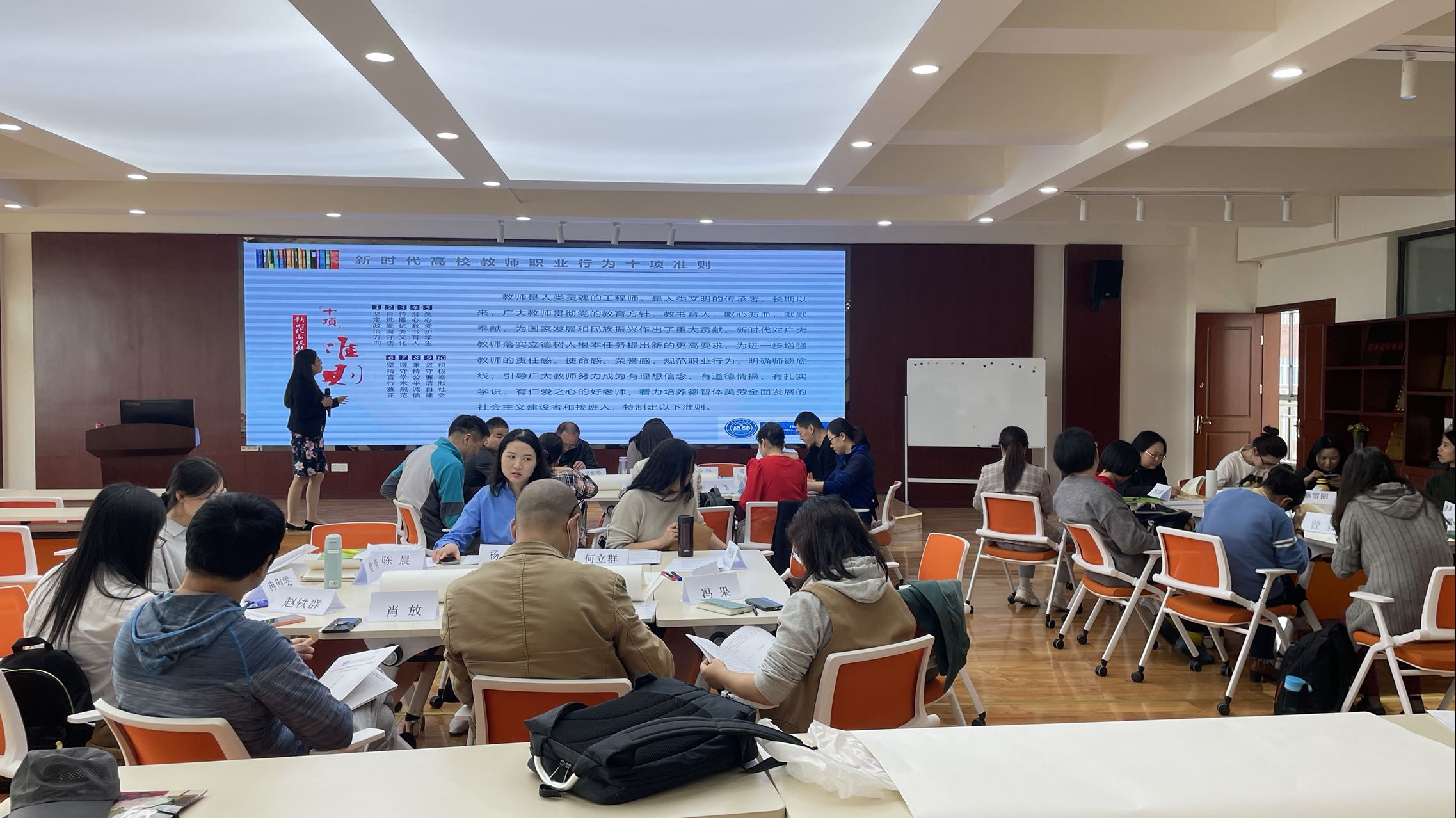 刘咏梅书记领学了《新时代高校教师职业行为十项准则》,《十项准则》规范了高校教师行为,要求高校教师要坚定政治方向、自觉爱国守法、传播优秀文化、潜心教书育人、关心爱护学生、坚持言行雅正、遵守学术规范、秉持公平诚信、坚守廉洁自律、积极奉献社会。刘书记指出,《十项准则》为教师职业行为划底线、明确职业规范,是师风师德建设的进一步深化,是塑造教师美好形象的重要举措,这对广大教师落实立德树人根本任务提出了更高要求,有利于进一步增强教师的责任感、使命感、荣誉感,规范职业行为,明确师德底线,中心全体教师要牢记准则内容,努力成为“四有”好老师,着力培养德智体美劳全面发展的社会主义建设者和接班人。