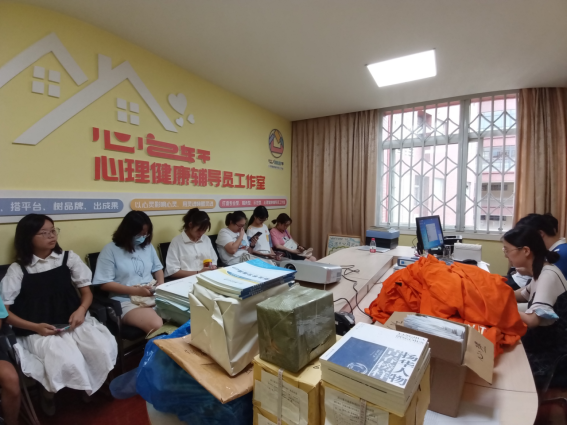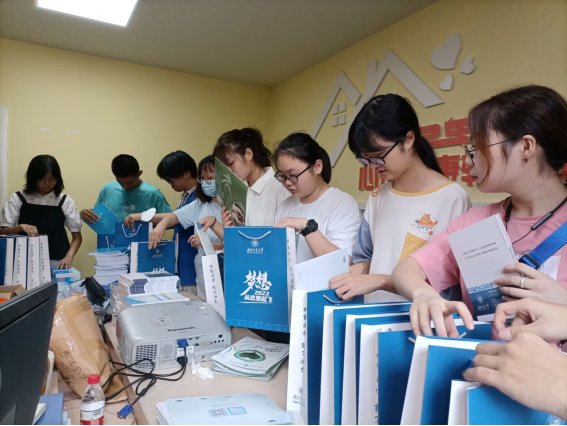 接着大家一起整理了为新生准备的新生大礼包,大礼包里面包含了新生体育课程手册、新生入馆攻略、大学新生心理适应小贴士手册、新生学习指南、实验室安全手册、瓜子影视 定制口罩等物品,恭候2022级心理人的到来。