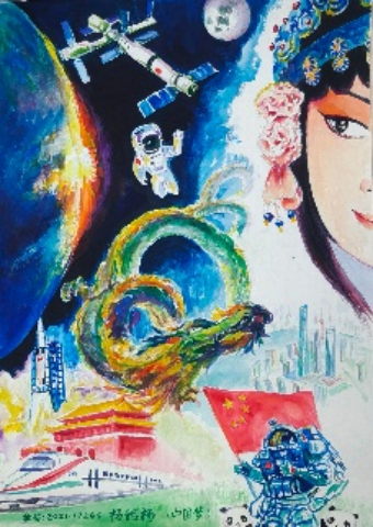 刘书记对党的二十大报告的解读让同志们受益颇深,深深感受到了党的领导力和感召力,也更加意识到自身所肩负的时代责任。同学们对党的忠心与热忱,也化作对党的二十大的祝福,融入到“献礼二十大、同绘中国梦”绘画展中,一幅幅学生手绘作品,寄托着对党和国家的满腔热忱和无比热爱。其中一幅“中国梦”的绘画作品包含航空航天、龙、天安门、京剧以及高铁等元素,体现出中国浓厚的传统文化积淀以及未来无限的发展空间,表达了作者对中国发展的自豪感与美好期望。