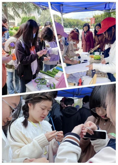 在“一心一意,以文润心”活动现场(犀浦校区南门小广场、九里校区图书馆门口),同学们参与的情况比较火爆。“扭扭郁金香”、“巧解连环”和拓印活动让不少同学乐在其中。刘娣老师引导同学们拓印心理疏导相关的词句、体验破解鲁班锁、九连环套等益智游戏,利兹学院的余典老师现场指导同学们负责制作“扭扭花”。这些活动向同学们展示古人的智慧,用中华优秀传统文化沁润同学们的心田。