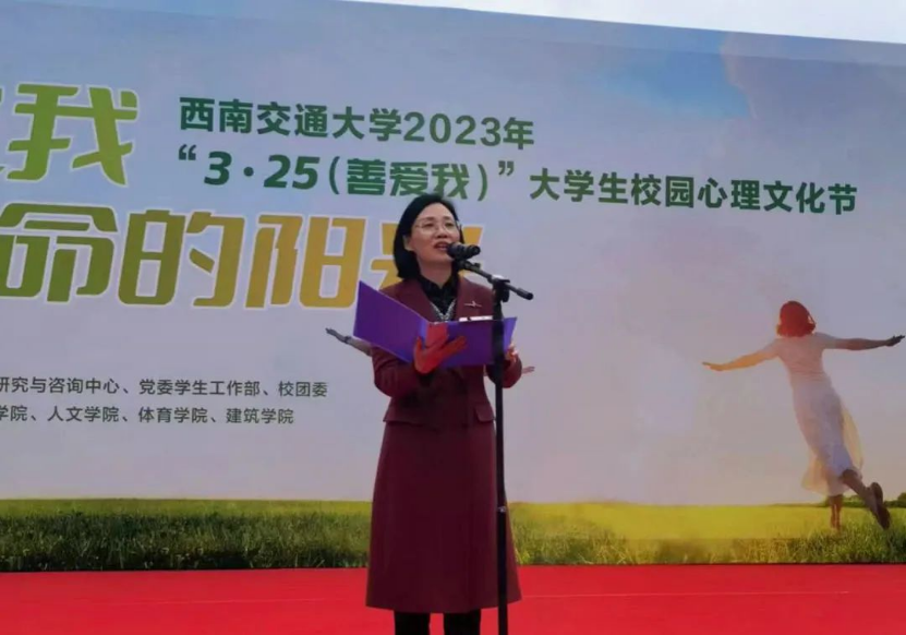 随后,校党委副书记杨爱华发表讲话。杨爱华副书记在讲话中表示,代表王顺洪书记和杨丹校长对活动的举办表示热烈的祝贺!并强调指出,大学生心理健康教育工作是学校立德树人工作的重要一环,对学校的人才培养工作和学生成长成才都具有重要的意义。一直以来,学校高度重视心理健康教育工作,关心关爱学生们的健康成长。学校提出“3·25”谐音“善爱我”的心理健康教育理念,发起并带动西部多所高校,加强心理健康教育引导,帮助同学们增强心理素质,提升社会适应能力,不断健全完善人格,做一名志趣高洁、充满活力,能够善爱自己、善爱他人、善爱社会的新时代青年。今年大学生校园心理文化节将更多精彩活动转移至线下、转移到现场,让同学们通过身临其境的参与,通过师生与朋辈的沟通交流,学习心理健康知识,了解增强心理健康的途径,掌握科学、有效的心理调适方法,以科学的态度面对各种心理困惑,真正感受“善爱青春之我,拥抱生命的阳光”的重要意义。