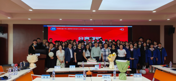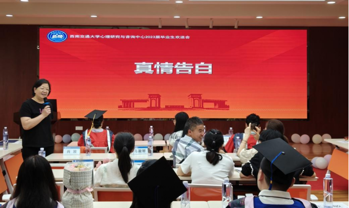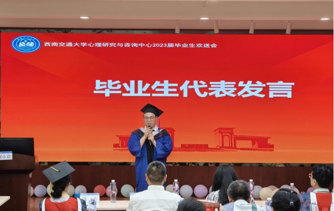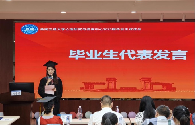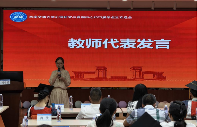 随后,教师代表冯缙、马淑琴、李启明、冉俐雯、冯果以及毕业班辅导员靳涵分别表达了对毕业生的祝愿。冯缙老师希望同学们在自己选的路上,不断的学习,大胆一点,松弛一些,自在热烈地踏上未来之路;马淑琴老师以一个狼和羊的寓言故事,希望同学们只想着一件事,明天要奔跑得更快;李启明老师祝愿同学们毕业快乐,以后幸福快乐;冉俐雯老师祝愿大家未来可期,人生很长,机会很多,慢慢走吧;冯果老师希望同学们悦纳自我,追求自我价值的实现。靳涵老师祝福同学们赤诚善良,爱人爱己。最后,刘咏梅书记希望同学们牢记交大精神,努力走好自己的路,去继续创造幸福人生,西南交大永远是大家的家,记得常回家看看!