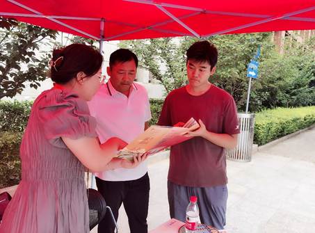 招生宣传工作中,两位老师为高中生耐心介绍学校背景、学科设置、耐心解答学生疑问。