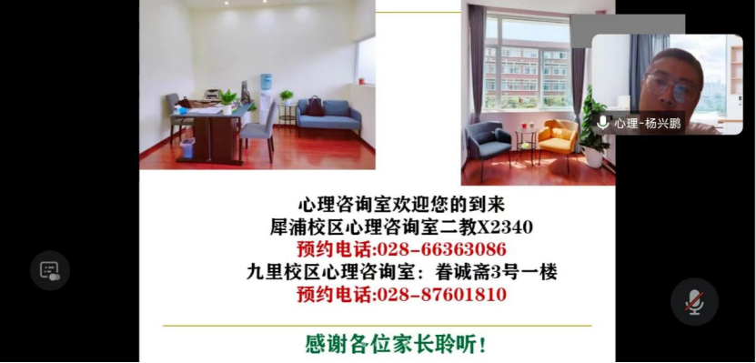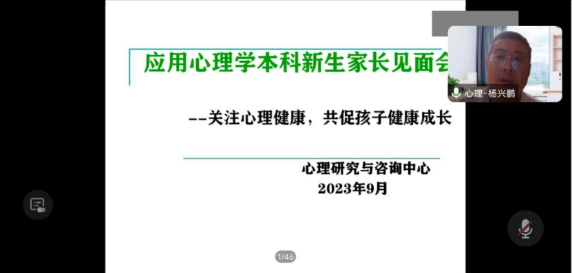 会议第二项,杨兴鹏老师介绍心理健康知识。杨老师以《关注心理健康,共促孩子健康成长》为题,向家长讲解大一新生将会面临学习内容与学习方式的转变、职业规划和自我认识的挑战、自我管理和时代给予的挑战等困难,呼吁家长转换角色,为孩子提供更多精神支持。杨老师还介绍了心理问题的判断标准,帮助家长识别抑郁症、双相情感障碍等常见的心理问题,建议家长和学校并肩合作,对心理问题积极关注、科学干预。
