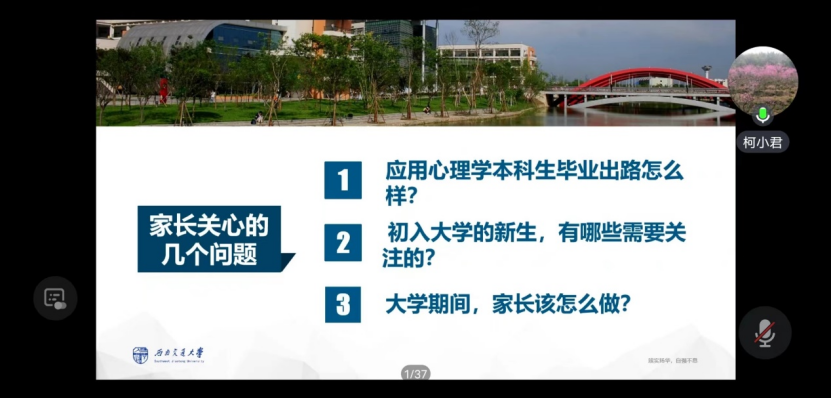党委副书记柯小君围绕家长关心的应用心理学本科生毕业出路、初入大学新生的主要困惑、家长角色作为作出细致的解答,并对家长提出几点建议:转变思想观念、引导学生做好大学四年乃至更长目标规划、正确认识专业、帮助孩子培养对挫折的承受力、关注孩子心理健康、家校社会协同。