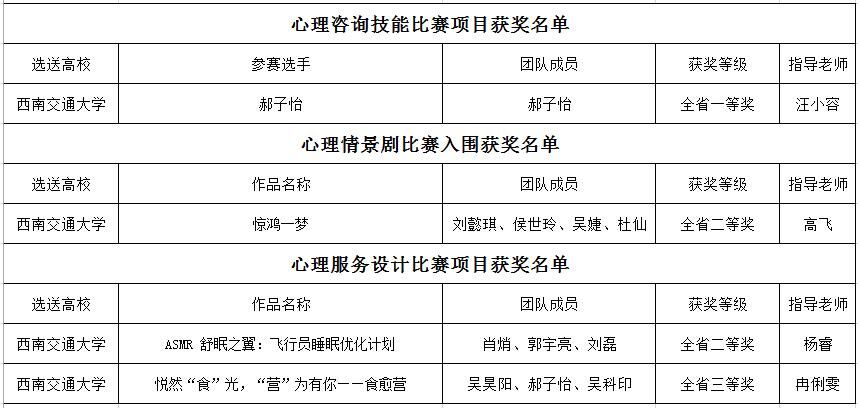 自10月收到参赛通知以来,中心领导高度重视,积极组织本科生、研究生同学踊跃报名参赛。在两个月的备赛时间里,各参赛队伍和指导老师反复研讨方案、多次请教校内外专家指导、评审,选送出心理咨询技能类选手1人、心理情景剧类参赛队伍2支、心理服务设计类参赛队伍2支。在汪小容老师、高飞老师、杨睿老师、冉俐雯老师的指导下,个人和团队斩获全省一、二、三等奖,取得优良成绩。