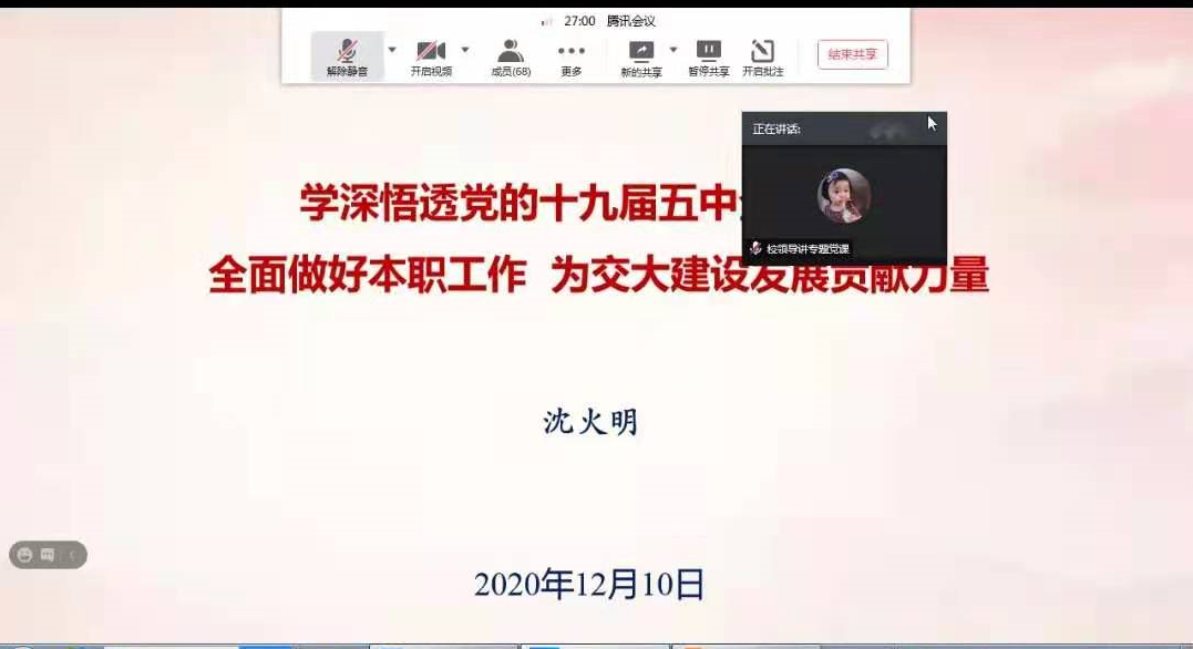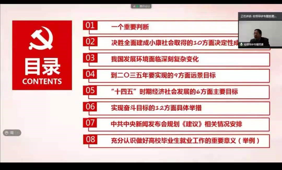 在会上,校党委沈火明副书记从一个重要判断、决胜全面建成小康社会取得的10方面决定性成就、我国发展环境面临深刻复杂变化、到二〇三五年要实现的9方面远景目标、“十四五”时期经济社会发展的6方面主要目标、实现奋斗目标的12方面具体举措、中共中央新闻发布会规划《建议》相关情况安排、充分认识做好高校毕业生就业工作的重要意义八个方面为与会党员详细讲述了十九届五中全会的核心要义、目标和举措,并结合高等教育规律和就业发展新形势、新要求、学校发展实例进行深刻讲解,为全体党员深入学习十九届五中全会精神,用全会精神武装头脑、指导实践、推动工作做了全面的辅导。他强调,在今后和当前一个时期,全校党员要把学习宣传全会精神作为一项重要的政治任务,领导干部要带头原原本本学,原汁原味学,要全面系统学,结合实际学,融会贯通学,将十九届五中全会精神贯彻落实到我校人才培养和学校“双一流”建设中,以实际行动为培养可担当民族复兴大任的时代新人,为培养德智体美劳全面发展的社会主义建设者和接班人而努力奋斗!