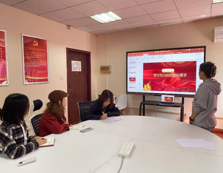 随后,党支部书记结合心理学专业特点,深入探讨了责任担当的重要性。她指出,作为研究生党员,要充分认识到自身在科研、学习和社会活动中的责任,不仅要做好个人的学业和研究,更要关心同学、服务集体。党员要勇于担当,积极参与到支部建设和校园活动中,成为同学们学习和生活中的榜样。