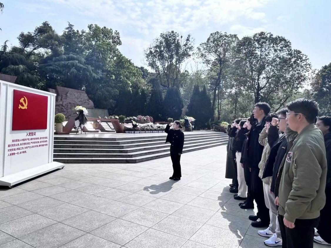 队伍时,全体师生面向烈士纪念碑肃立,随着现场奏乐齐声高唱国歌,向烈士墓鞠躬,献花,静默中仿佛能听见先烈们为民族解放抛头颅、洒热血的壮烈回响。随后,樊老师带领全体党员同学重温入党誓词:"我志愿加入中国共产党……"。铮铮誓言穿透云霄,站在烈士墓前宣誓,比任何课堂讲解都有冲击力。