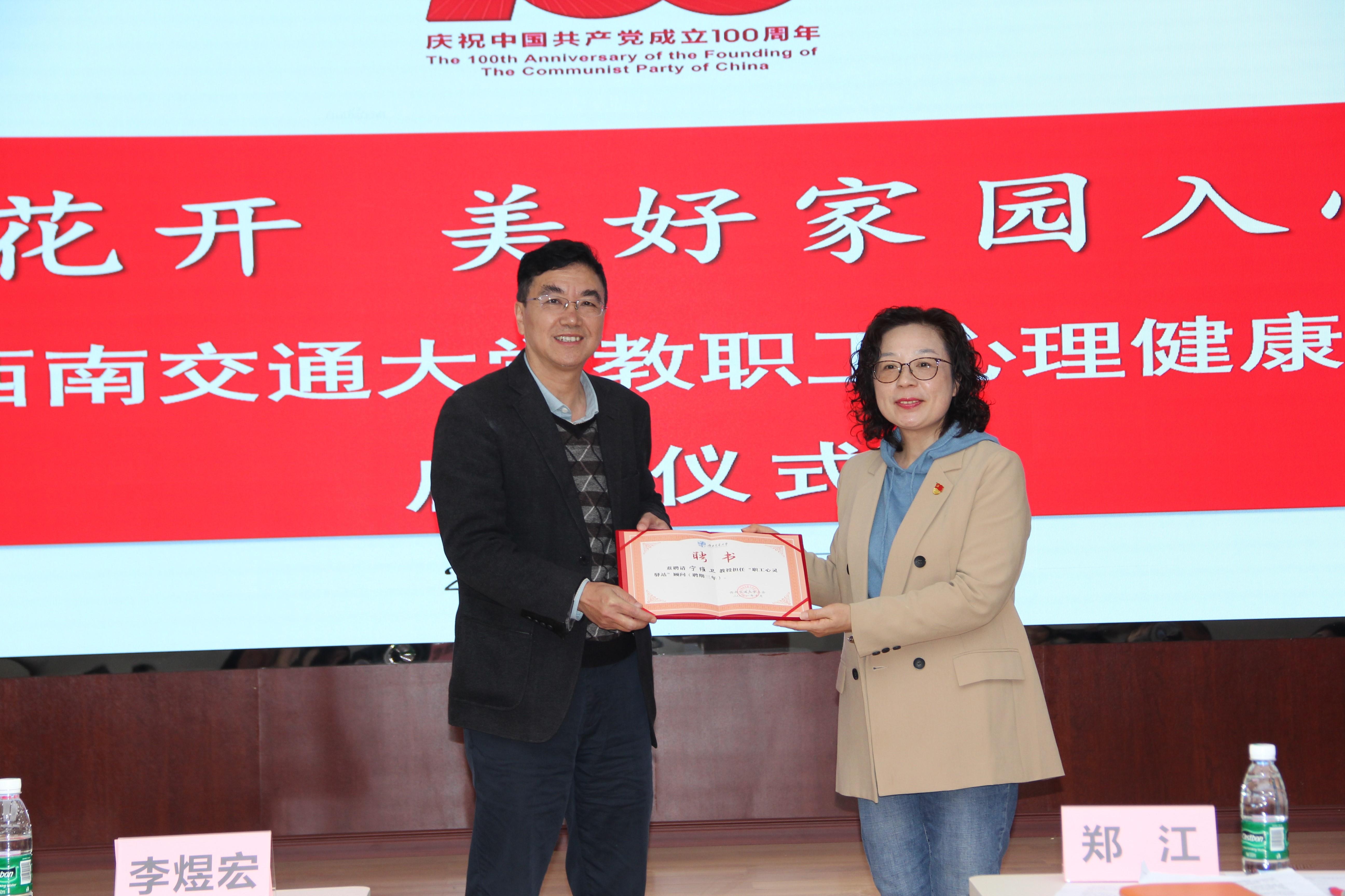 随后,郑江主席向宁维卫教授颁发了“职工心灵驿站”顾问聘书。宁维卫教授是教育部新一届高校学生心理健康教育专家指导委员会副秘书长、四川省心理学类教学指导委员会主任委员、教育部全国高校心理健康教育与咨询示范中心负责人、瓜子影视