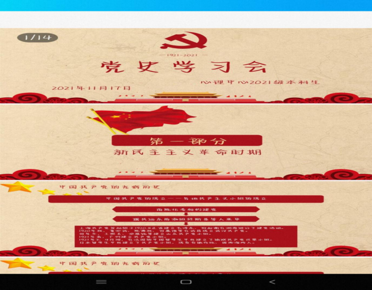 团支书通过生动有趣的PPT将党史分为从土地革命到遵义会议、从长征结束到抗日战争胜利、从解放战争到三大战役三个部分进行讲解,让同学们深刻地认识到新民主主义革命时期中国共产党的发展的艰辛与胜利的来之不易。