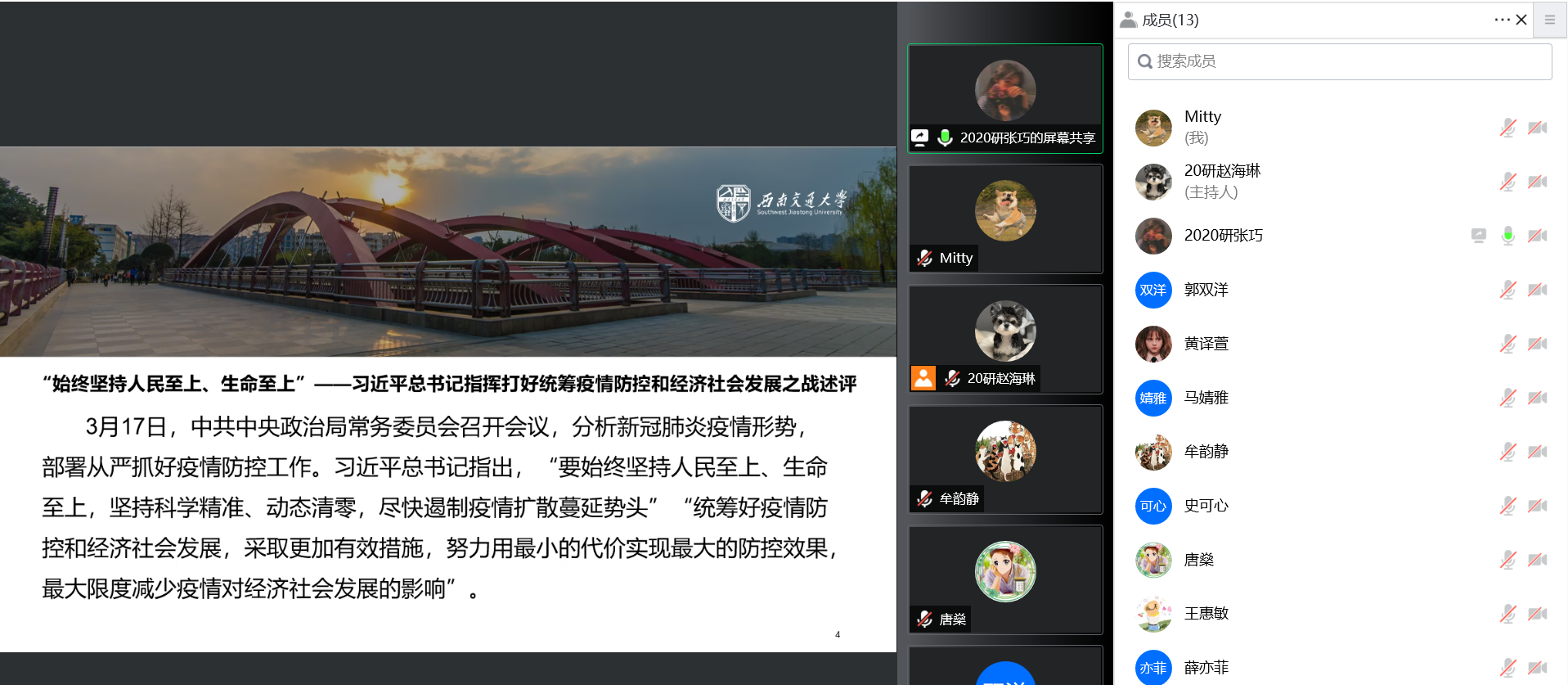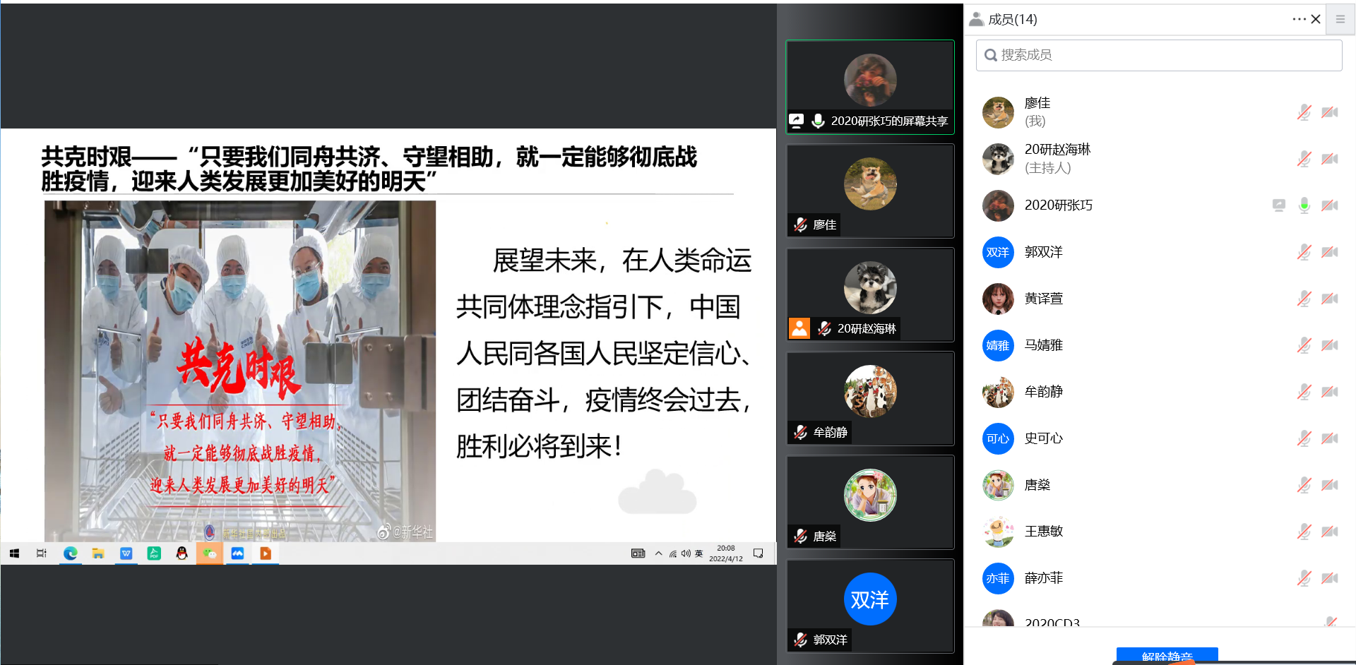 2022年4月12日20:00,瓜子影视 研究生第二党支部全体党员在线上组织学习《习近平总书记指挥打好统筹疫情防控与经济社会发展之战述评》。本次活动由张巧同志带领全体党员同志通过阅读相关资料、观看学习视频等方式进行学习。